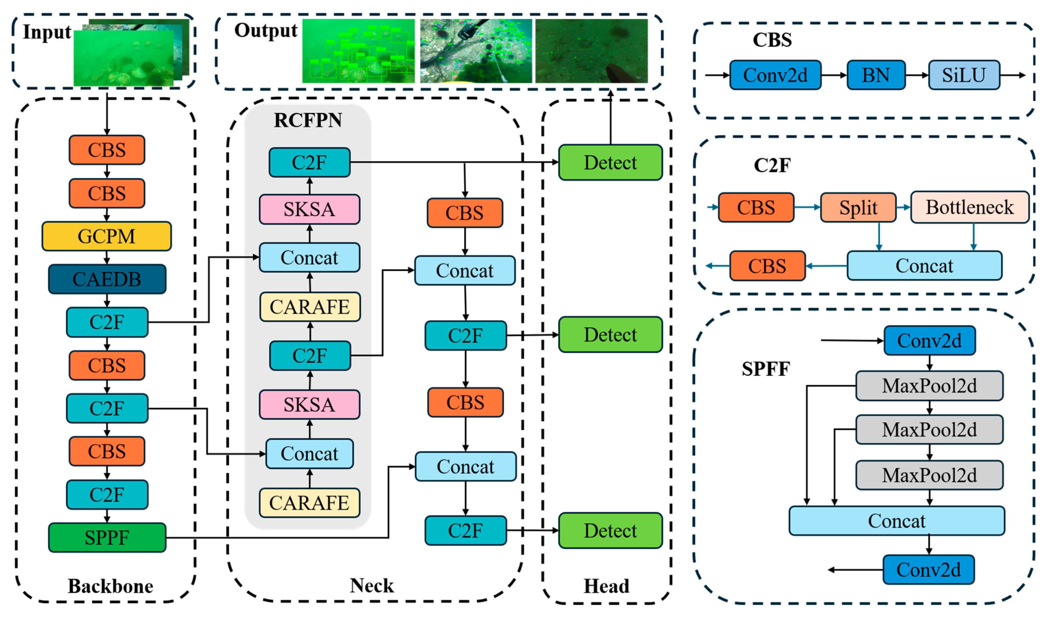 RCFPN—refines multi-scale feature fusion by embedding regional contextual cues and ecological scale priors, leading to substantial improvements in detecting small marine organisms.