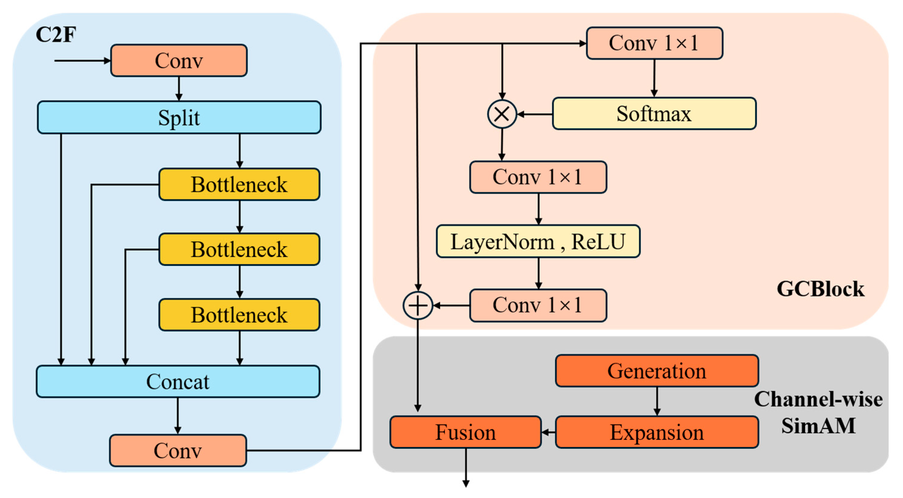 The GCPM integrates GCBlock and Channel-wise SimAM into a single efficient framework, with the following computational flow Equation (5):