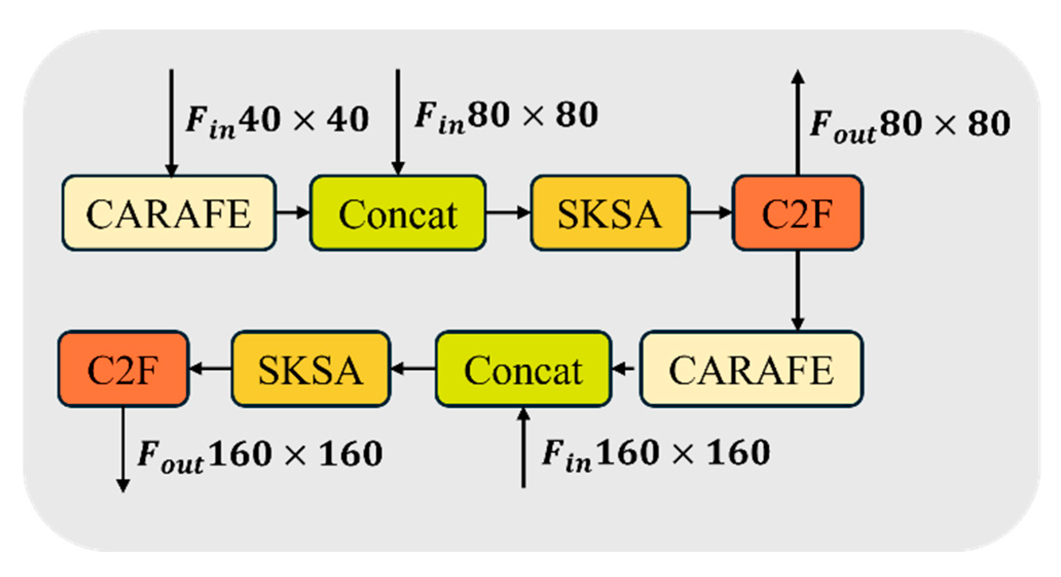 The standard FPN aggregates multi-level features primarily through direct concatenation, which often fails to emphasize salient information while introducing redundant background noise. This limitation undermines the discriminative power of subsequent decoding stages. To overcome this, the SKSA module is introduced. In contrast to conventional channel-only attention mechanisms, SKSA employs a separable kernel structure that efficiently models spatial dependencies. By adaptively emphasizing informative regions and suppressing irrelevant background responses, SKSA enhances the network’s capacity to capture fine-grained details in cluttered underwater environments substantially, leading to notable improvements in detection accuracy, particularly for small and partially occluded objects.