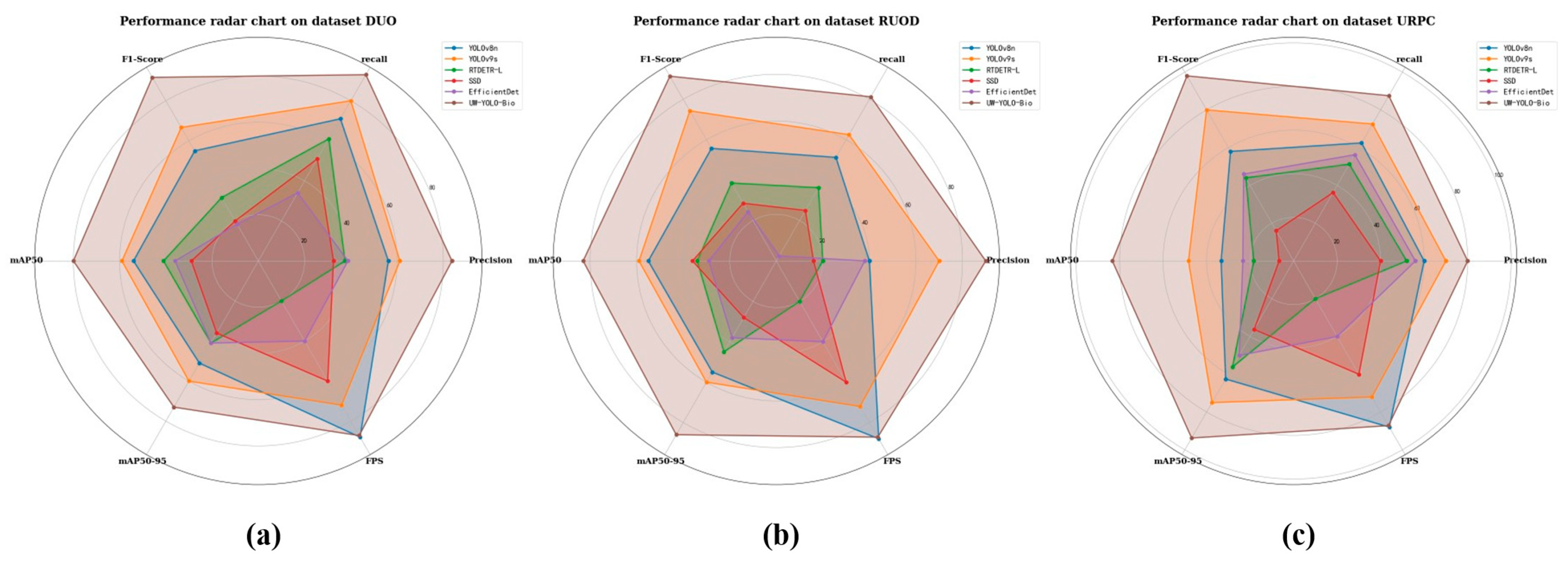 In this section, we present a comprehensive comparative evaluation of UW-YOLO-Bio against several state-of-the-art object detectors across the DUO, RUOD, and URPC datasets. The evaluated competitors include prominent detectors from the YOLO family (e.g., YOLOv8n [