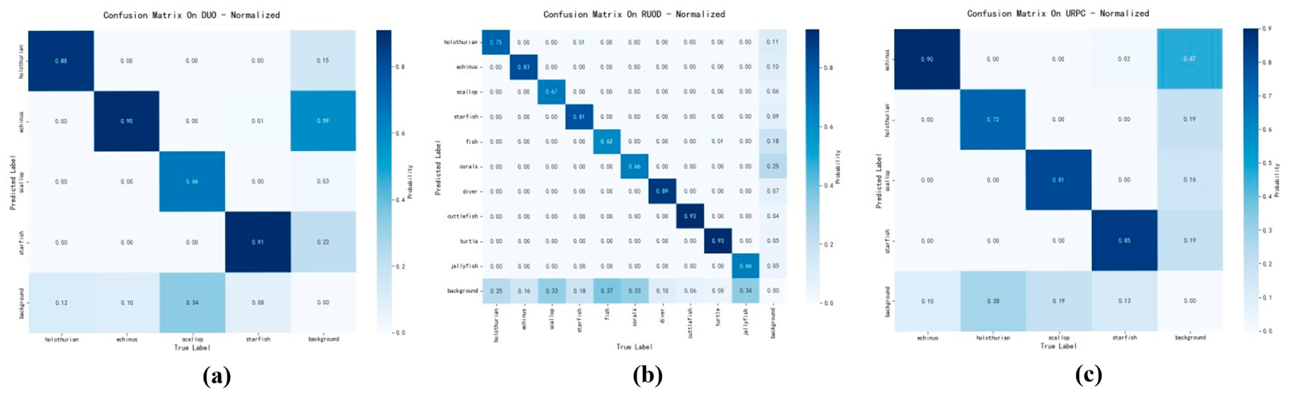 On the DUO dataset, the proposed model demonstrated high accuracy across all four categories (echinus, holothurian, starfish, scallop). The confusion matrix revealed a low false detection rate, indicating the model’s effectiveness in distinguishing visually similar entities, such as holothurians and the background regions.
