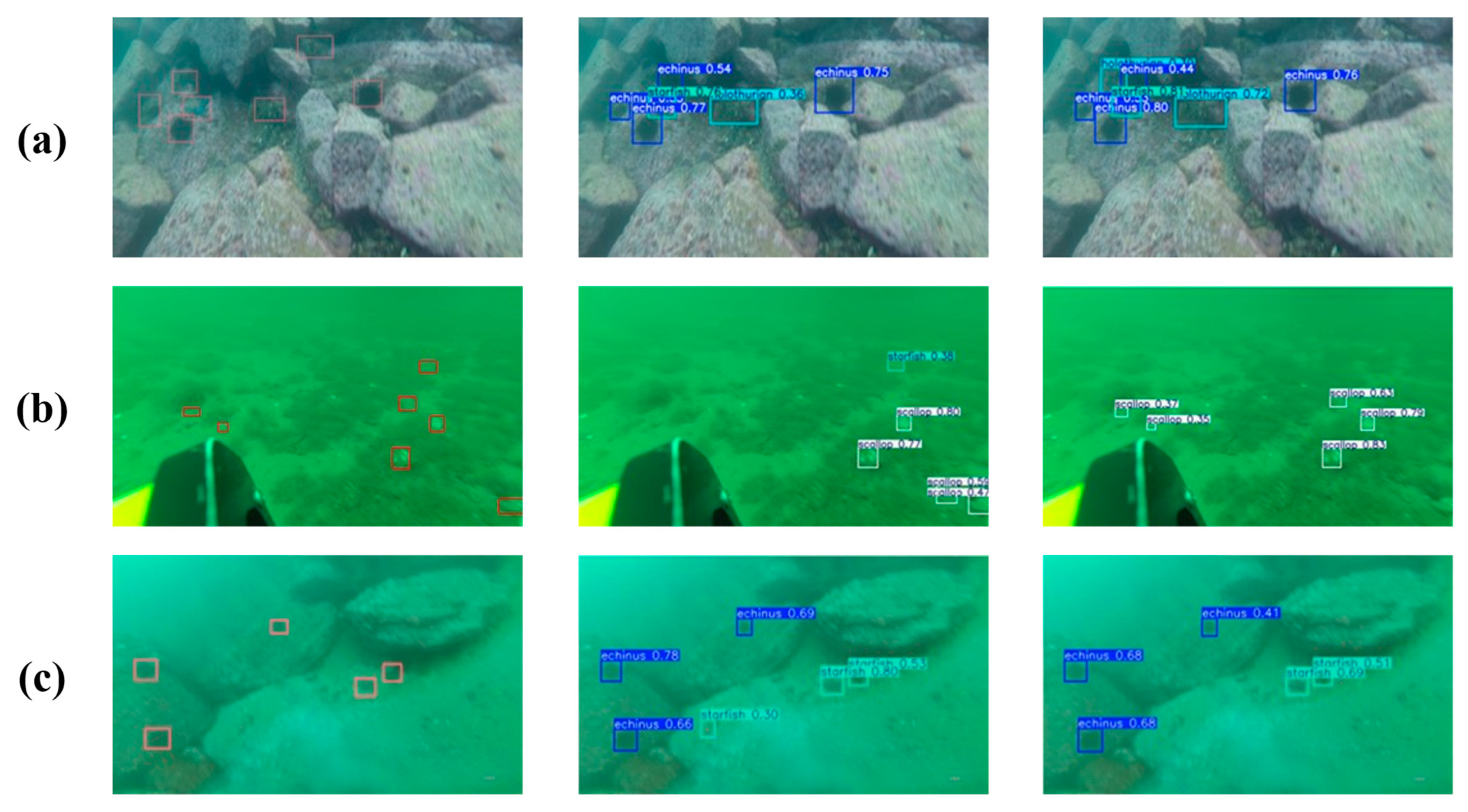 Figure 8c highlights instances where our model reduces false detection rates, particularly false positives. These false detections in the baseline model occur due to the bluish-green tint of the water, which causes objects like starfish to closely resemble the background. Our model exhibits improvements in mitigating this issue by better distinguishing between foreground objects and the ambient environment through the CAEDB and attention mechanisms, thereby reducing misclassifications and enhancing overall detection accuracy.
