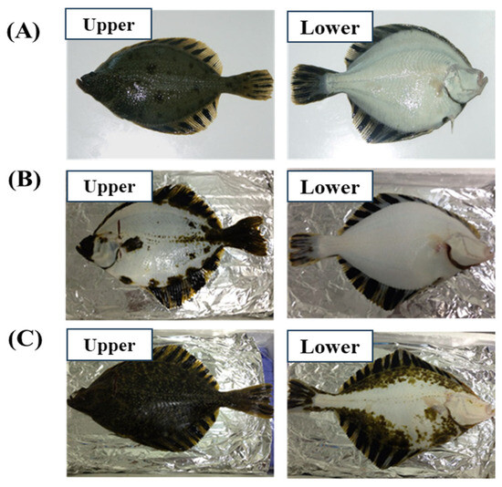 Images of upper and lower tissues of Platichthys stellatus and tissue classification. Normal (A), whitening; shows white spots (more than 20%) on the upper skin, while the lower skin retains a normal color (B), darkening; shows dark spots (more than 20%) on the lower skin, while the upper skin retains a normal color (C).