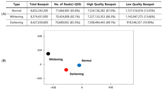 The high-quality base ratio obtained through sequence filtering was the lowest in whitening brain samples at 86.3%, whereas darkening brain samples showed the highest quality at 89.1%. Libraries from the three samples (normal, whitening and darkening) were compared by principal component analysis based on the representative hit classification against the M5nr database (The non-redundant database developed at Argonne National Laboratory containing sequences and annotations from multiple sources. The database is based on the use of MD5 checksums of the sequences, separating sequence data from the annotation data from multiple publicly available databases.) in CLC genomics workbench (version 12.0.3, Qiagen, Inc., Hilden, Germany). As a result, normal pigmentation, whitening and darkening were found in distinct anatomical location (Figure 2).