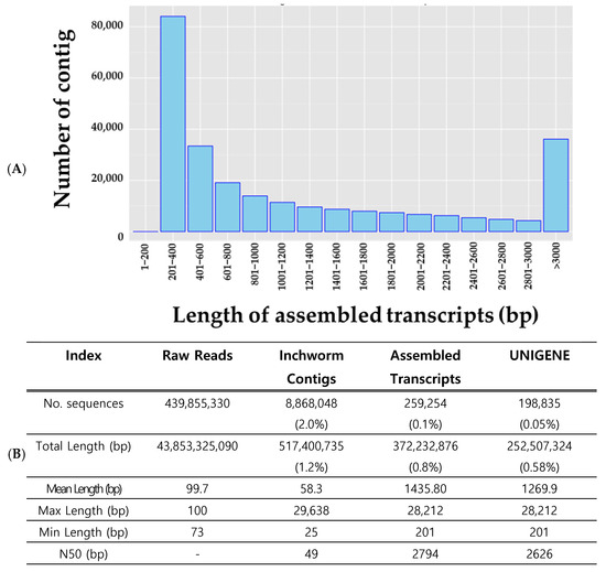 A total of 43.8 Gbp of raw sequence data were generated across all samples. After filtering and de novo assembly, the total assembled transcript length was 517 Mbp following the Inchworm process, which was further reduced to 372 Mbp in the final assembly stage, corresponding to 1.18% and 0.85% of the raw data, respectively. The number of sequences decreased from 439,855,330 to 8,868,048 after inchworm processing, and ultimately to 259,254 (0.1%). The average sequence length was 1435.8 bp, with a maximum of 28,212 bp (Figure 3B). The length distribution of the assembled transcripts is shown in Figure 2A. Among the assembled transcripts, 84,084 (32.43%) were between 201 and 400 bp in length, whereas 36,132 (13.94%) were over 3000 bp long. To confirm the unigene sequences, redundancies in the assembled transcripts were eliminated using a clustering method. After clustering, the total number of sequences decreased from 259,254 to 198,835. This indicated that 77% of the transcripts assembled by Trinity were retained, whereas 23% were removed as redundant. On a nucleotide basis, 372.2 Mbp was reduced to 252.5 Mbp, indicating a 32% reduction (Figure 3B).