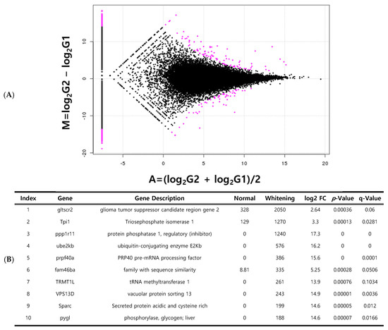 Genes specifically expressed in whitening brain tissue compared to normal brain tissue. Volcano plot of differentially expressed genes (DEGs) (A); list of the top 10 expressed genes (B). red dots indicate specifically expressed genes.