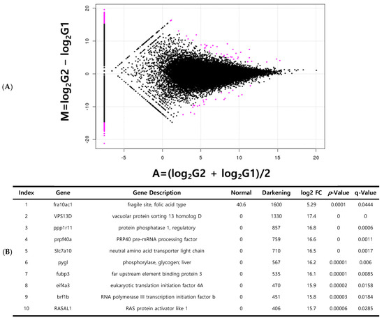 In total, 1053 DEGs were identified between normal and whitening brain tissues (Figure 5A). Of these, 517 genes were upregulated and 536 genes were downregulated in whitening tissues compared to normal tissues. Among these DEGs, 824 were expressed in only one sample group. The top 23 DEGs were selected for further analyses. The most significantly upregulated genes in the whitening brain tissue were GLTSCR2, ODZ1, and PPP1R11 (Figure 5B). Between normal and darkening brain tissues, 642 DEGs were identified, consisting of 335 upregulated and 307 downregulated genes. A total of 514 genes were expressed in only one tissue group. The top 24 statistically significant DEGs were selected (Figure 6A). The most highly expressed genes in darkening brain tissue included FRA10AC1, VPS13D, and PPP1R11 (Figure 6B).