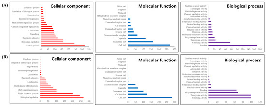 Gene Ontology (GO) analysis of Platichthys stellatus transcriptomes. Correlations for Cellular Component, Molecular Function, and Biological Process in Whitening-Brain (A), and Darkening-Brain (B).