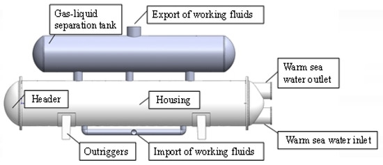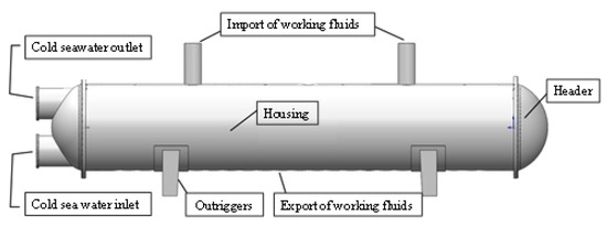 The condenser is similar to the evaporator, and the structure is shown in Figure 3. But since there is no need for gas-liquid separation, there is no gas bag on the upper part of the condenser, and the cold seawater flows into the inlet from the lower part of the tube bundle and out of the outlet at the upper part. And the working fluids enters from the lower part of the heat exchanger shell course, and condenses into liquid working fluids through the shell course.