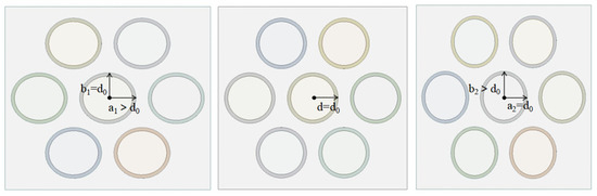Figure 4 is the object of the simulation, showing the cross-section of the heat exchanger tubes in the evaporator and condenser. The picture in the middle is a standard round tube, and the parameters of the heat exchanger tube are in Table 2. The picture on the left shows the cross-section of the heat exchanger tube changing in the X-axis direction, and the picture on the right shows the cross-section of the heat exchanger tube changing in the Y-axis direction. The change in the X and Y axes will make the round tube become an elliptical tube.