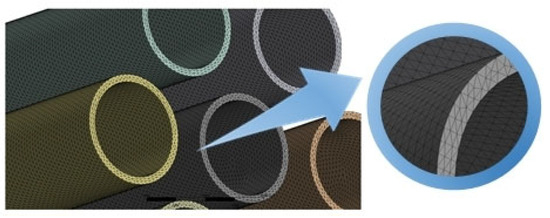 The heat transfer is involved in the heat exchanger simulation in this study, so mesh encryption of solid-vapor and solid-liquid contact surfaces is required. Mesh encryption [50,51] refers to the application of a boundary layer at the wall surface contact. Due to the relatively small thickness of the boundary layer, its effect can be neglected in the mainstream flow region. However, in the area near the wall, the fluid movement is intense and the temperature changes significantly. Therefore, to ensure the accuracy of heat transfer calculations, a certain number of boundary layers and the growth rate of the boundary layer are set in the flow and heat transfer near the wall. The mesh division of the heat exchanger tubes and the fluid domain is shown in Figure 5.