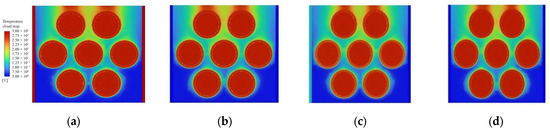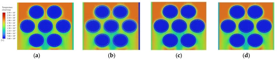 As can be seen from Figure 12, when the cold and hot fluid inlet temperatures are 6 °C and 20 °C, the Y-axis length of the condenser is kept at 10.6 mm, and with the increase of the X-axis length, the cold fluid outlet temperature increases steadily within a small range from 6.12 °C to 6.14 °C, and the hot fluid outlet temperature is in an increasing trend. The X-axis length is kept unchanged, and with the increase of the Y-axis length, the cold fluid outlet temperature is in an increasing trend, and the hot fluid outlet temperature has a decreasing trend in the selected change interval.