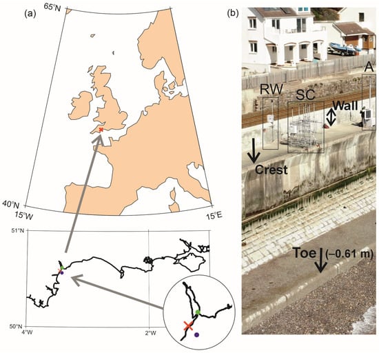 (a) The WireWall study location in Dawlish (X) alongside regional wave (●) and water level monitoring (●) in southwest England (mapping software by Pawlowicz [27]) and (b) the WireWall monitoring systems positioned at the sea wall crest (SC) and railway line wall (RW) adjacent to the anemometer (A). The structure ‘toe’ elevation is given (in m OD) and both the ‘crest’ representing the highest point of the primary sea wall structure and the secondary ‘wall’ separating the railway from the pedestrian walkway are identified.