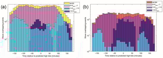 In Figure 4 the time of every individual wave overtopping event at SC (Figure 4a) and RW (Figure 4b) is plotted relative to predicted high tide. When the total number of wave overtopping events are separated into transformed wave height categories we see the following: