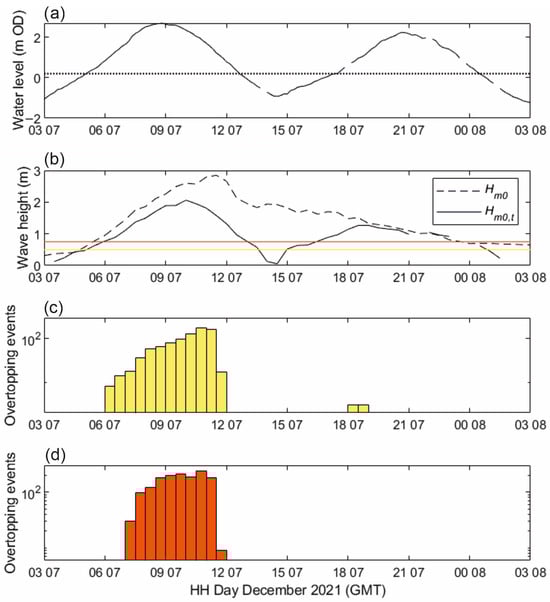 Conditions during Storm Barra: (a) water level (m OD), where the horizontal dotted line is the threshold for overtopping (Figure 3i, 0.2 m), (b) coastal, Hm0, and transformed, Hm0,t, wave height (m), where the solid horizontal lines are the thresholds for overtopping for the transformed waves (Figure 3c), colour coded by the location of the overtopping (SC in yellow, 0.5 m, and RW in orange, 0.75 m), (c) number of wave overtopping events at the sea wall crest (SC) and (d) number of wave overtopping events at the sea wall crest (RW).