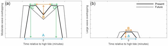 The annual duration of wave overtopping at any vertical sea wall will be the sum of the different contributions from the full wave spectrum. How the individual wave contributions change in future will vary due to local wave–tide–morphology interaction. Deeper water levels in front of a sea wall due to sea-level rise and beach lowering will cause complex and non-linear changes in the yearly overtopping event frequency distribution. Figure 6 is a schematic suggesting plausible changes in the yearly wave overtopping event frequency distribution for Dawlish, as an example of a beach fronted vertical sea wall exposed to a large spectrum of wind sea conditions. The present-day overtopping event frequency distribution for vertical sea walls is likely to have a common shape, i.e., the sum of a dominant ‘M-shaped’ moderate-sized wave distribution (Figure 6a) and smaller ‘n-shaped’ large-sized wave distribution (Figure 6b). Deeper water at the toe of a vertical sea wall will cause a longer overall duration of when wave overtopping could potentially occur either side of high tide (Section A, Figure 6) for both moderate- and large-sized waves. However, the number of waves overtopping within this extended duration will depend on the wave size. An increased duration may not simply enable time for more waves to overtop. For commonly researched large-sized (storm) waves, the number of waves overtopping for a limited number of hours at high tide is likely to increase (Section B, Figure 6b) as depth limitations reduce. Overall, both the number of large-sized waves overtopping at any instance and the duration of large-sized wave overtopping is likely to increase (Figure 6b). This in agreement with the findings of, for example, Hames et al. [14] and Almar et al. [9]. It should be noted there is the chance some of the waves at the lower end of this category could start to reflect at high tide. The rarely researched response of moderate-sized waves (<1.5 m, i.e., below the storm threshold) is much more complex, but crucial to understand the annual overtopping hazard due to their dominance within the yearly event frequency distribution. Overall, the duration of when moderate-sized waves could overtop will extend, but the overall number of waves overtopping could increase or decrease (Figure 6a). It is hypothesised the total number of waves will potentially decrease. At high tide (section B Figure 6a) wave reflection could occur for a longer duration and potentially occur for more waves within the moderate category, both reducing the overtopping frequency for a few hours over high tide. If the largest waves in this category experience reduce depth limitation, they are more likely to move into the large wave category and contribute further to the increase in large-sized wave overtopping at high tide. The water level enabling a maxima in the number of waves overtopping (sections C Figure 6a) will occur earlier and later in the tide, which is when the water levels change more quickly, potentially reducing the duration of maximum overtopping frequency. Thus, the number of waves overtopping is again likely to reduce.