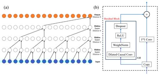 Schematic Diagram of TCN Structure (a) the basic structure of the TCN, and (b) the detailed structure of the residual block.