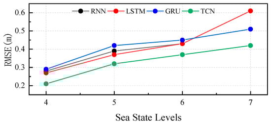 As illustrated in Figure 7, the prediction errors of all models increase monotonically with the sea state level, consistent with the heightened nonlinear dynamics of wave propagation under more severe conditions. Across all sea states, the TCN consistently exhibits lower prediction errors compared to recurrent architectures, suggesting comparatively superior predictive performance. Moreover, the rate of error growth in TCN remains modest across sea state levels, indicating enhanced robustness to nonlinear variability.
