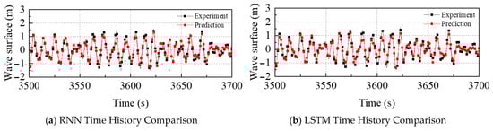 Here, RMSE denotes the Root Mean Square Error, represents the predictedwave surface at time i, is the observed wave surface at time i, and is the total number of points in the error calculation. Unless otherwise specified, all prediction errors reported in tables and figures refer to Root Mean Square Error (RMSE) in meters.