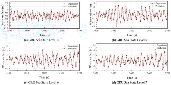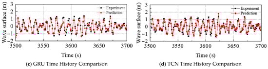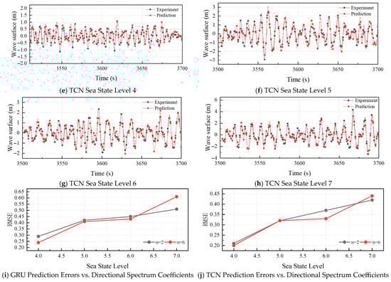 Analyses of TCN-WP and GRU-WP outputs are summarized below. The prediction errors for sea states 4–7 generated by the four models are listed in Table 4 and Figure 13. The detailed time history comparisons for GRU and TCN models under various sea states and directional spectra are presented in Figure 13. Figure 13a,e demonstrates that under sea-state 4 with directional spreading parameter n = 6, both models accurately reproduce surface elevation phase across most records; however, minor phase lags emerge in medium- and low-frequency bands, with systematic underestimation of certain large amplitudes. Nevertheless, RMSE remains lower than that obtained for n = 2.