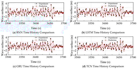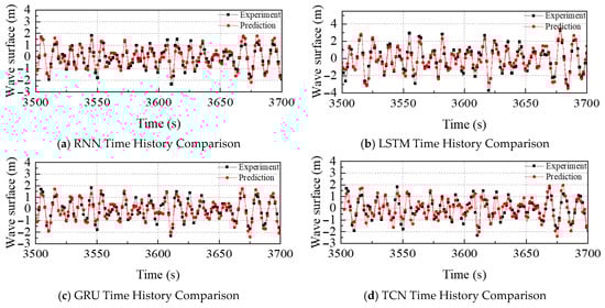 Under Sea-State 4, all four models accurately reproduce the temporal evolution of free-surface elevation, capturing both wave amplitude and phase with high fidelity. As depicted in Figure 8, the models exhibit different error characteristics that directly explain their respective RMSE values. The RNN-WP variant (Figure 8a) demonstrates optimal performance in the high-frequency band, particularly during intervals 3545–3555 s and 3625–3650 s, but it exhibits a slight phase lag in the low-frequency components. These combined errors result in an RMSE of 0.28 m. The LSTM-WP model (Figure 8b), an enhanced recurrent architecture, exhibits slightly superior overall skill but shows localized performance degradation in the same high-frequency windows. This degradation, attributable to LSTM’s stronger temporal dependencies becoming detrimental at short wave periods, is a key contributor to its RMSE of 0.27 m. The GRU-WP model (Figure 8c) outperforms LSTM-WP in tracking high-frequency surface features but demonstrates systematic amplitude errors at low frequencies (e.g., 3580 s and 3600 s). These low-frequency amplitude inaccuracies are the primary reason for its higher total RMSE of 0.29 m. Finally, the TCN-WP model (Figure 8d) excels at low-frequency reconstruction, accurately tracking the dominant wave crests and troughs, but incurs significant phase and amplitude errors in the high-frequency range (e.g., around 3625–3650 s). Despite these localized high-frequency inaccuracies, its superior performance in the energy-dominant low-frequency band leads to the lowest overall RMSE of 0.21 m among all four models. The time history comparisons for all four models at Sea State 4 are shown in Figure 8.