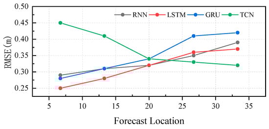 Prediction distance differentially impacts model performance through a spatial evolution mechanism, revealing fundamental conflicts between wave propagation physics and model architectures. For recurrent models (RNN/LSTM/GRU), RMSE increases monotonically with distance. This is due to the cumulative complex disturbances during wave propagation, which gradually exceed the memory limit of the recurrent models. Conversely, the convolutional TCN excels at long distances by leveraging dilated convolutions’ large receptive field to exploit spatial correlations and smooth high-frequency disturbances. However, its performance degrades sharply at short ranges (<15 m) because the dominant mechanism shifts from spatial-correlation-dominated regimes to time-continuity-dominated regimes, whereas the TCN model is better suited for the spatial-correlation-dominated regime. Thus, the impact of prediction distance is fundamentally a model-physics matching problem: TCN should be prioritized for long-range predictions, while recurrent models are superior for short-range forecasts.