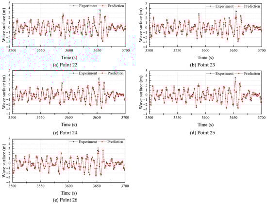 During spatial wave propagation, the cross-correlation between gauges diminishes with increasing prediction distance. This subsection quantifies the impact of prediction distance under fixed conditions: sea state 5 and directional spreading coefficient n = 2. Target locations are positioned at full-scale separations of 6.7 m (gauge 26), 13.3 m (gauge 25), 20 m (gauge 24), 26.7 m (gauge 23), and 33.3 m (gauge 22). Input data consist of the initial 150 time steps recorded at gauges 1, 14, 15, 28, 29, 42, and 43. Table 5 summarizes the prediction errors for the four models at each downstream position (see Figure 14).