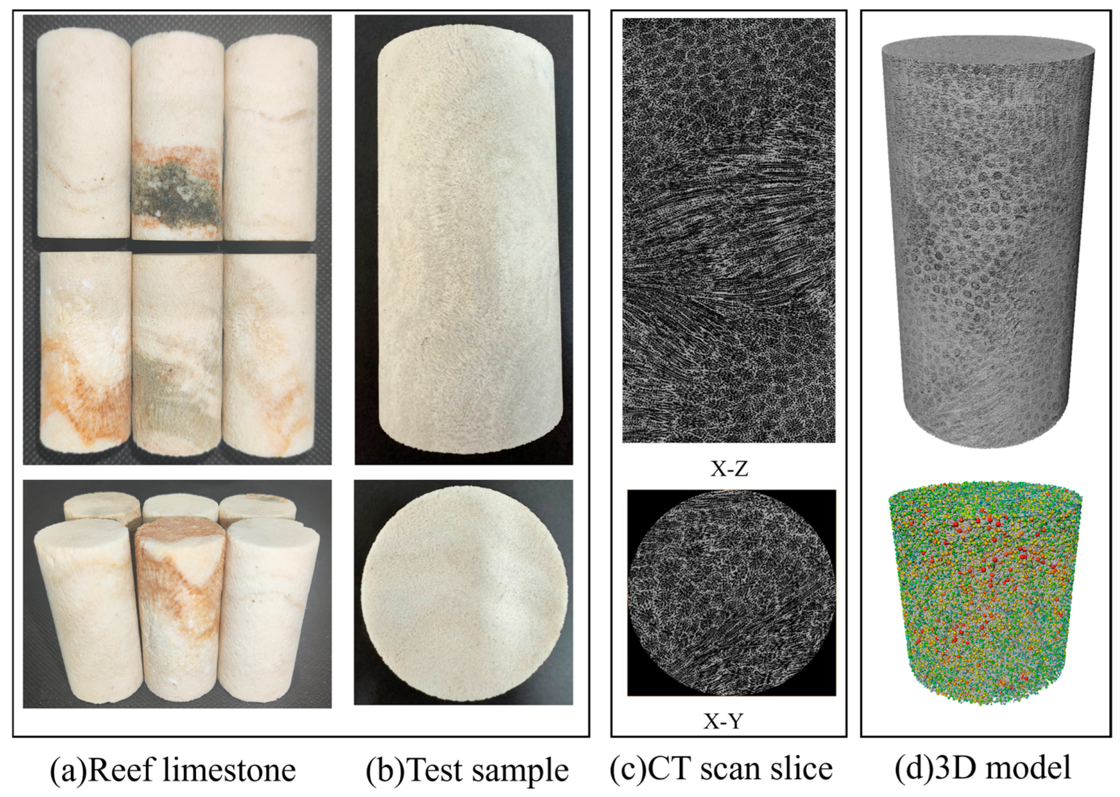 The reef limestone exhibits notable inhomogeneity and anisotropy [8,9]. Current research primarily focuses on its mechanical properties and damage mechanisms. This material possesses high porosity, well-developed pore structures, and low strength. It retained significant residual strength even after experiencing a tensile failure [10]. Despite extensive research on the mechanical issues related to reef limestone, comparatively little attention has been devoted to its permeability. Permeability is critical in activities such as underground cavern excavation, petroleum reservoirs, and natural gas extraction [11,12,13]. For most rocks, the characteristics of pore structure in porous media are closely related to their seepage properties [14,15,16]. The key interconnected pore structure in the reef limestone determines its permeability [17,18].