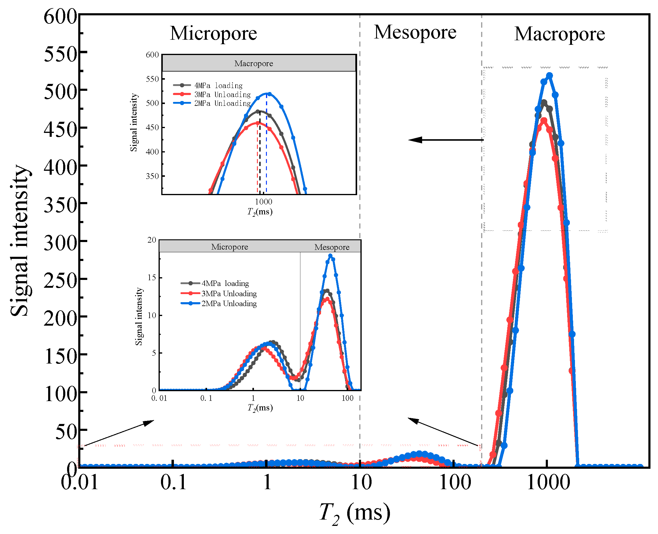 During the loading process, the main peak showed an overall leftward shift, indicating the compression of macropores, which reduced effective seepage channels and decreased permeability. In contrast, during the unloading process, the main peak of the T2 spectrum initially decreased and then increased. A sudden rise in permeability was observed when the confining pressure was reduced from 3 MPa to 2 MPa. This increase is supported by the T2 spectrum analysis during the unloading process. The recovery of macropores within the rock sample enlarged the seepage channel size, increased the volume of movable water, and created new effective seepage channels, thereby enhancing permeability.