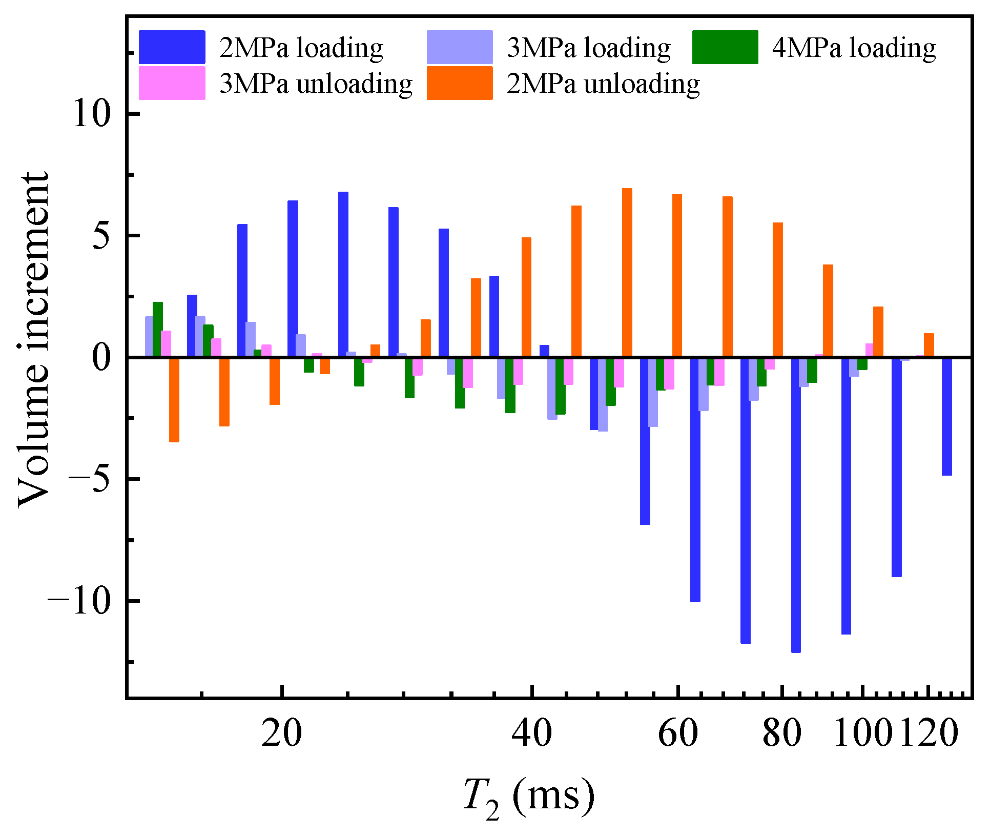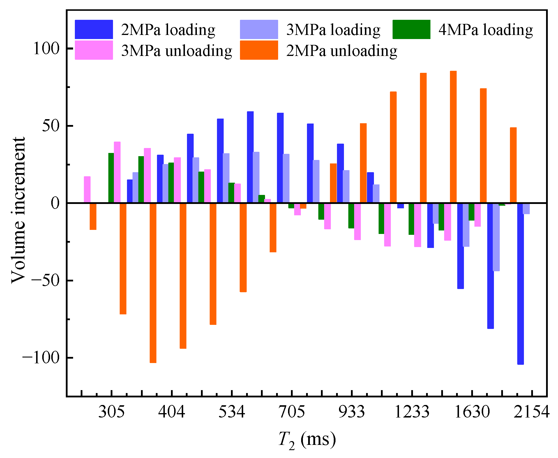 As shown in Figure 10a, the total pore volume increased during the loading process. This observation indicated that the initial application of confining pressure caused some pores to fracture, resulting in an increase in pore volume. Figure 10b shows the trend of the change in the main peak area of the sample. With the increase in confining pressure, the main peak area increases to different extents, indicating that during the loading process, some large pores are compressed, resulting in the formation of new relatively smaller pores or the generation of small cracks due to external forces. These pores and cracks are formed due to the reconstruction of external forces, but their corresponding relaxation time still falls within the main peak range, belonging to relatively small pores in the large pores. When the confining pressure is unloaded to 3 MPa, the main peak area shows a slight increase, indicating that during the release of confining pressure, some undamaged large pores begin to recover.