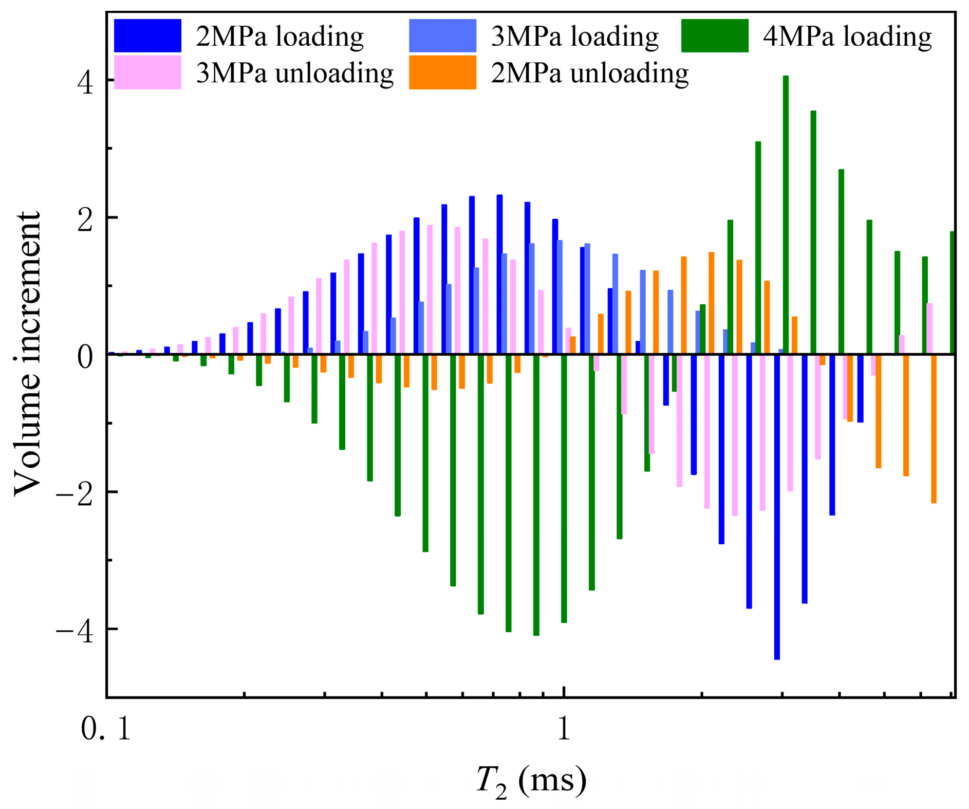 III. The confining pressure was then raised to predetermined levels (3 MPa and 4 MPa), following which the procedures in Steps I–II were repeated to measure sample permeability and T2 spectra at each pressure stage.