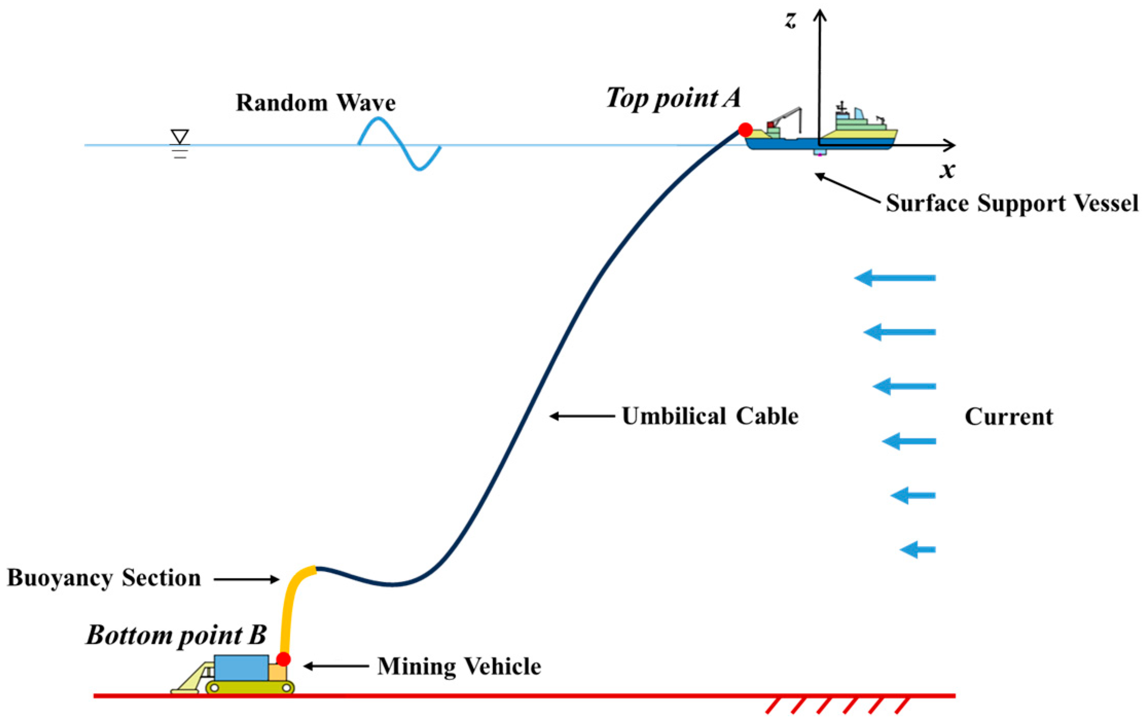 2]. In deep-sea mining operations, the umbilical cable must withstand not only the harsh and complex marine environment but also the dynamic loads induced by the motions of the surface support vessel and the seafloor mining vehicle. These coupled excitations can easily lead to hazardous failures such as entanglement, knotting, or even breakage, posing serious risks to the safety and continuity of mining operations [