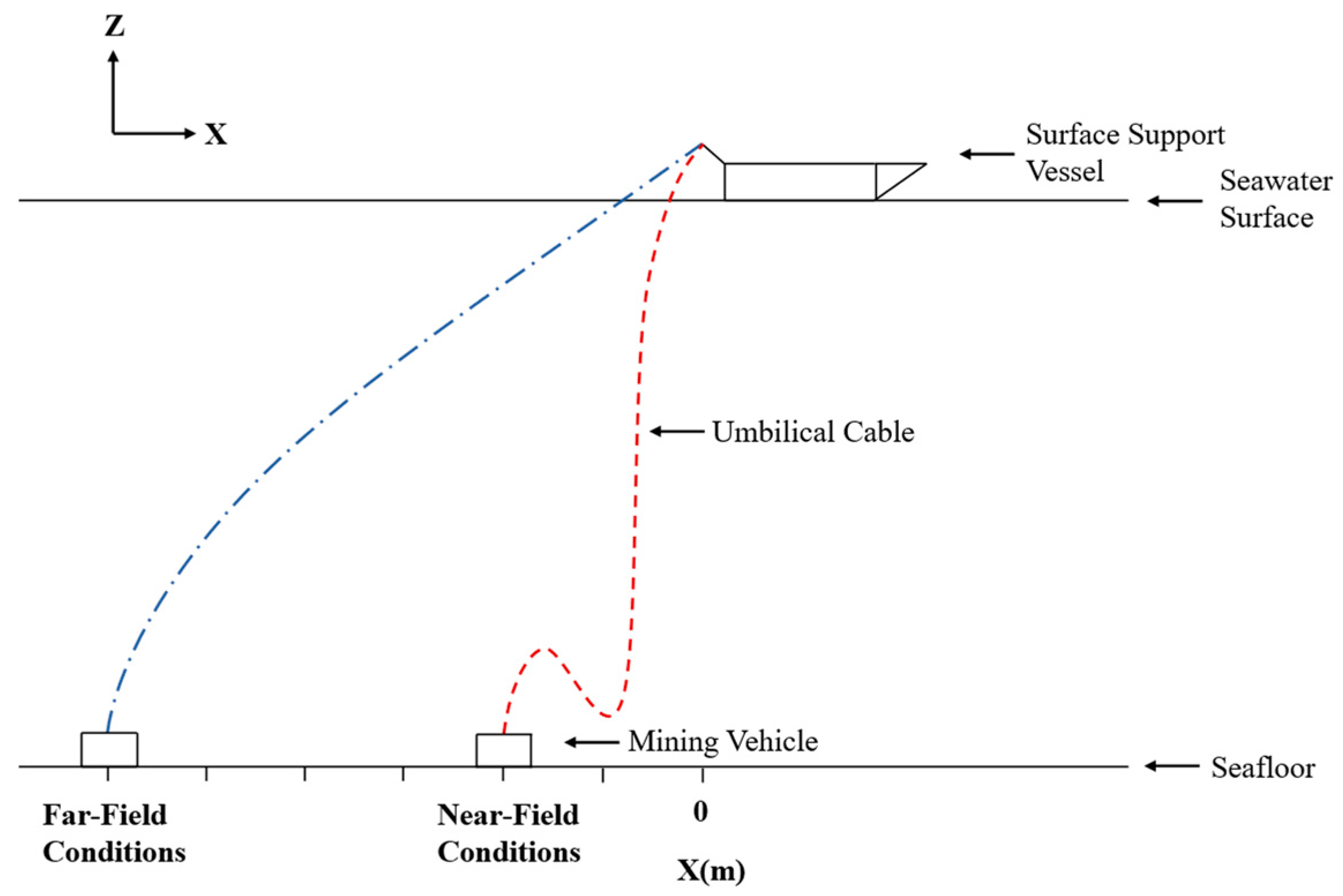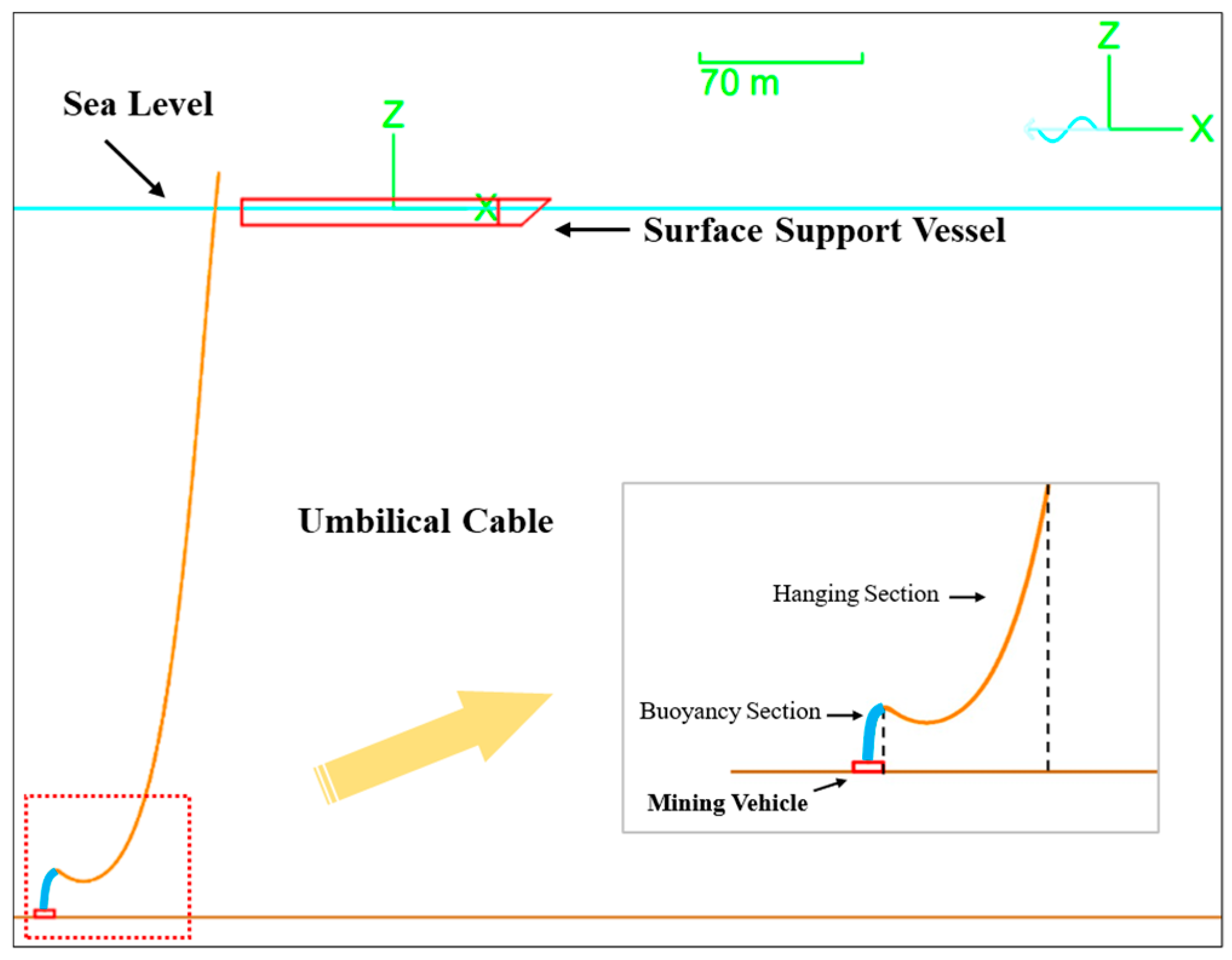 30], this can be achieved by adjusting the horizontal distance between the mining vehicle and the surface support vessel, thereby forming a wave-like configuration that effectively prevents compression of the umbilical cable.