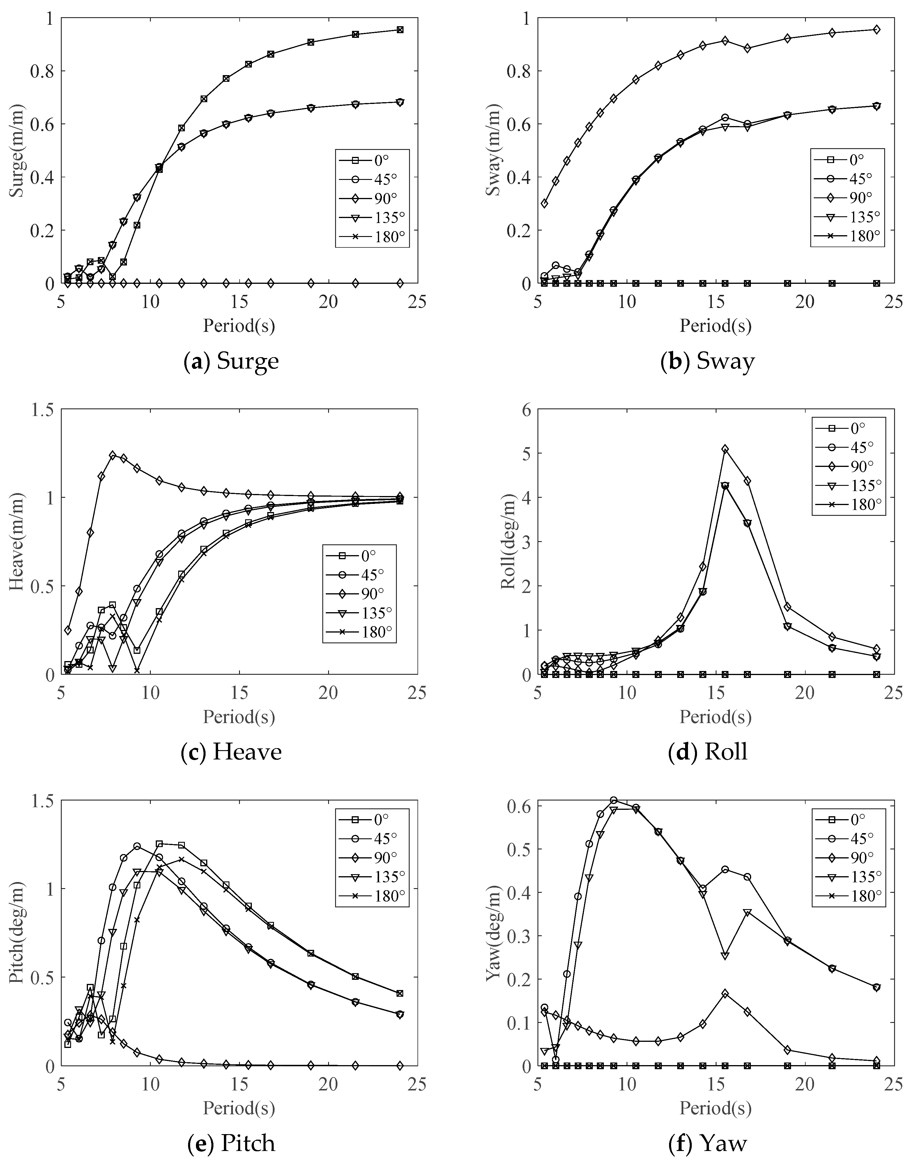The surface support vessel used in this study is characterized by a total length of 132.6 m and a beam of 27 m. It is designed with a maximum draft of 7 m and a displacement of approximately 18,467 t. The umbilical is connected to the surface support vessel at the stern, and the vessel’s motion in waves is transmitted to the top end of the umbilical. The vessel is modeled with six degrees of freedom corresponding to wave frequencies. The displacement Response Amplitude Operators (RAOs) of the surface support vessel are applied, as shown in