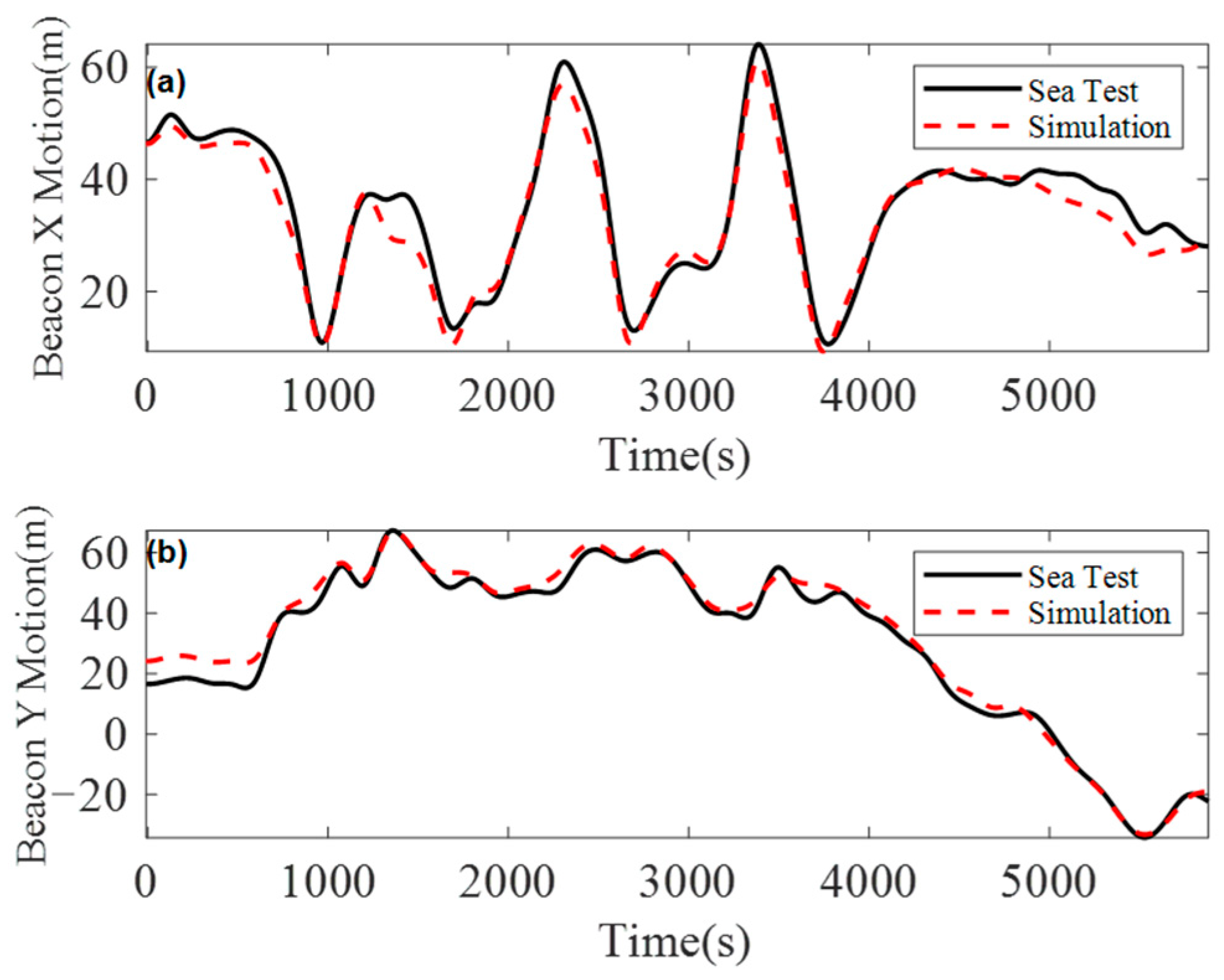 Under this condition, a coupled dynamic model corresponding to the actual sea trial environment at a water depth of 1072 m was established to simulate the dynamic response of the umbilical. From the simulation results, the displacement trajectory at the top of the buoyancy section was extracted and subsequently compared with the measured trajectory obtained from the beacon. The comparison reveals a strong agreement between the simulated and measured motion responses of the beacon, as shown in