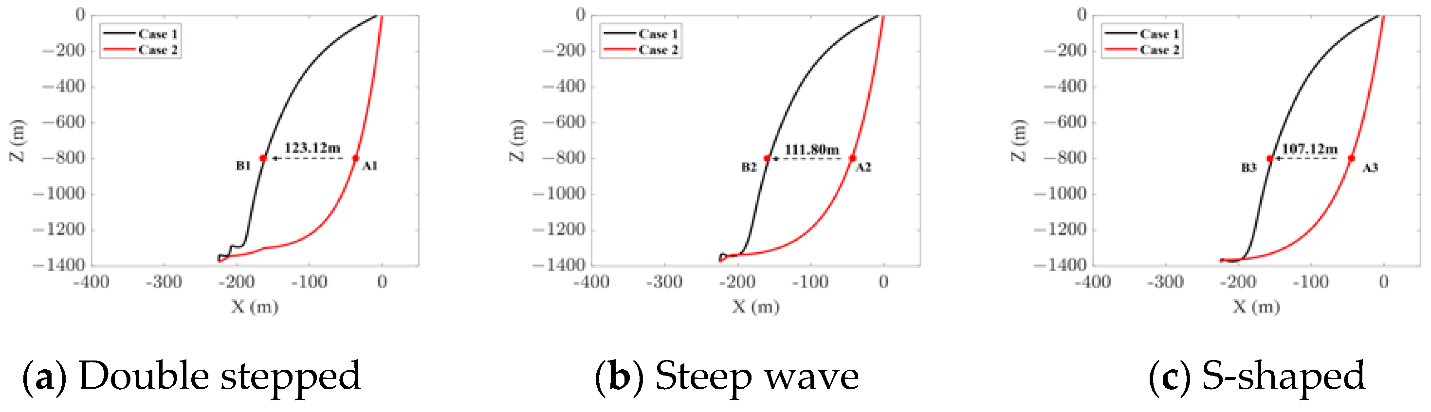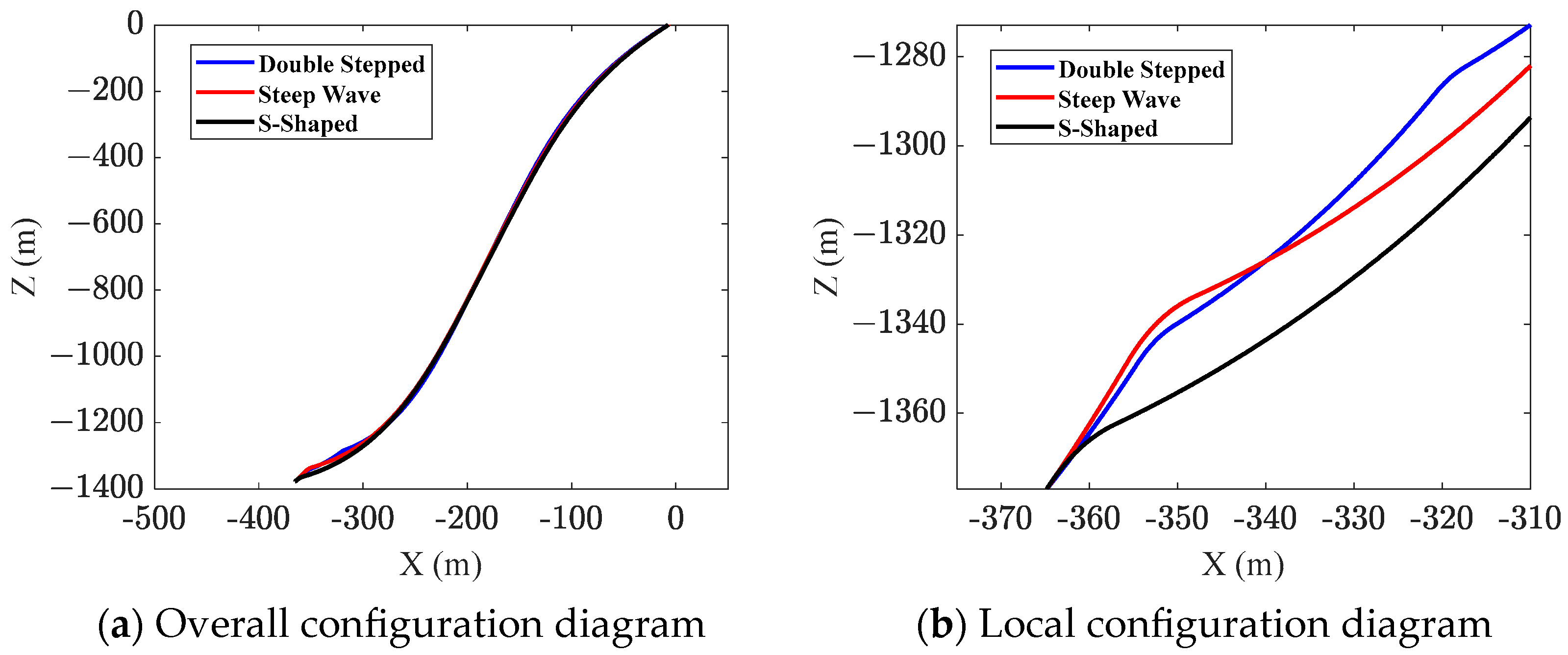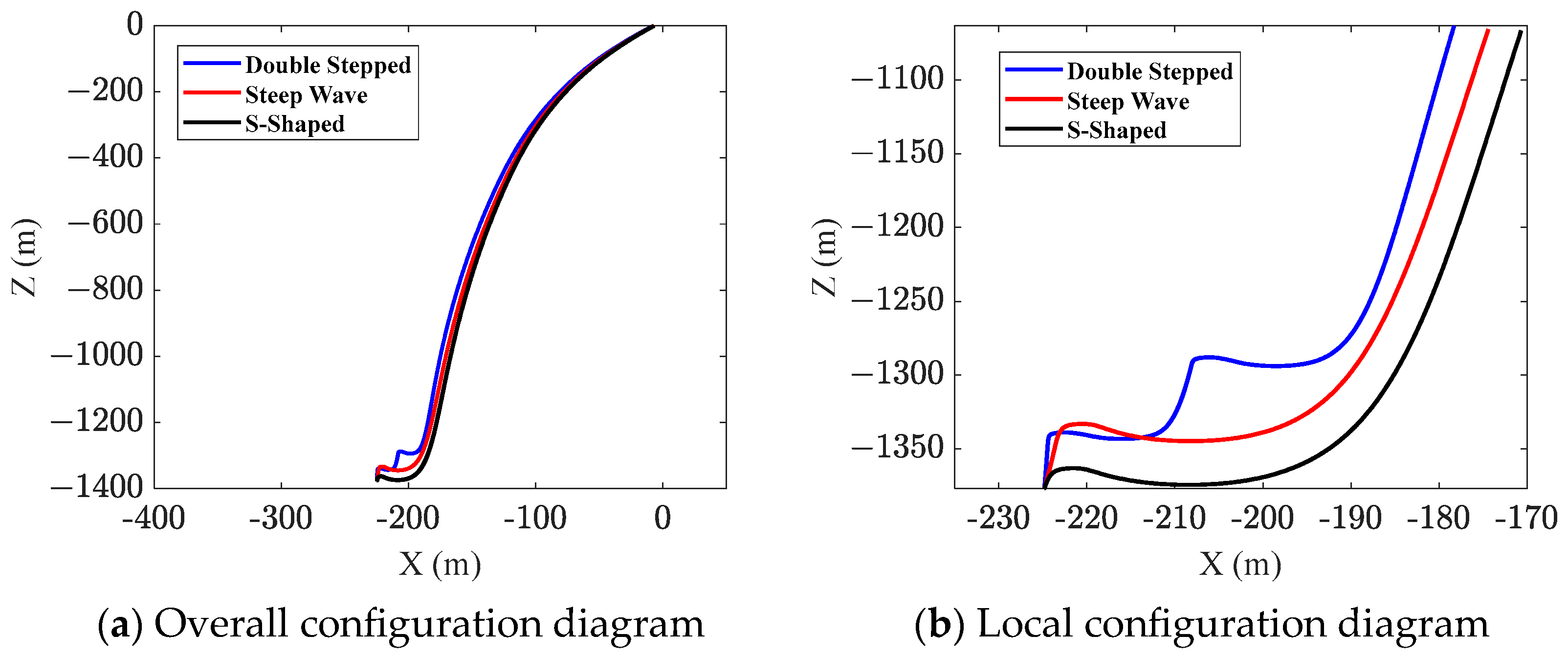 Figure 12. It was found that, at a water depth of 800 m, the lateral offset reaches 129.89 m for the double-stepped configuration, 121.70 m for the steep-wave configuration, and 107.12 m for the S-shaped configuration.