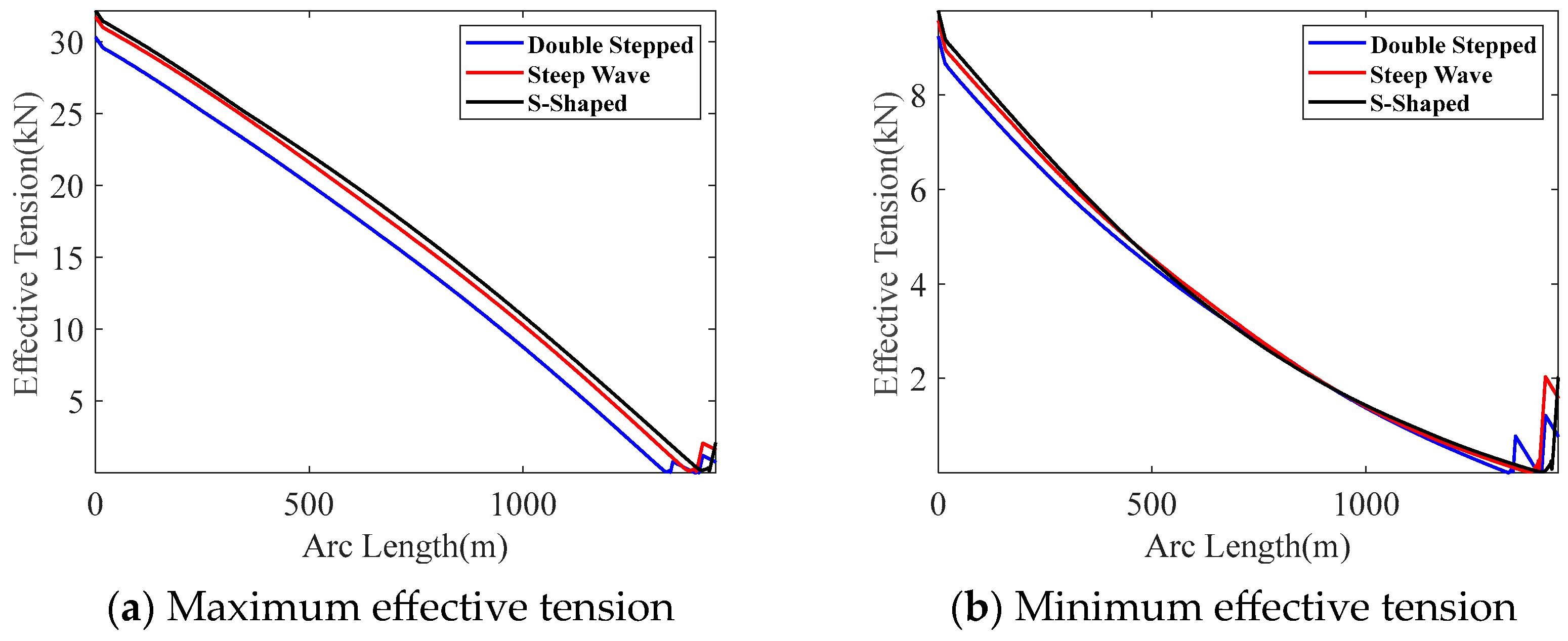 Figure 13b, the S-shaped and steep-wave configurations exhibit almost identical tension recovery magnitudes in the buoyancy section, whereas in the double-stepped configuration, the buoyancy section is split into two segments, resulting in two separate recovery processes and corresponding local peaks.