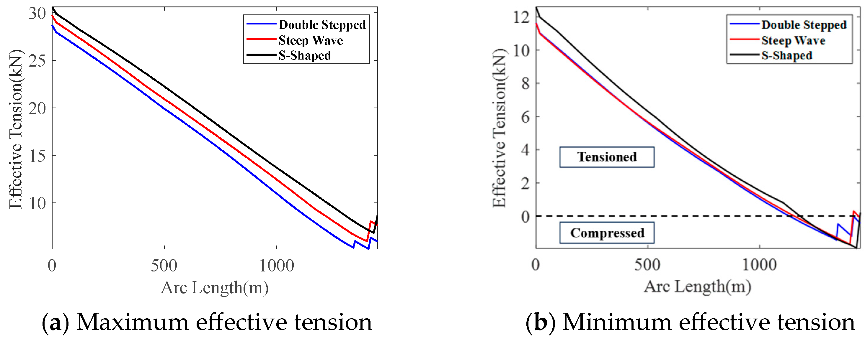 Figure 13b shows the minimum effective tension values corresponding to the three configurations.