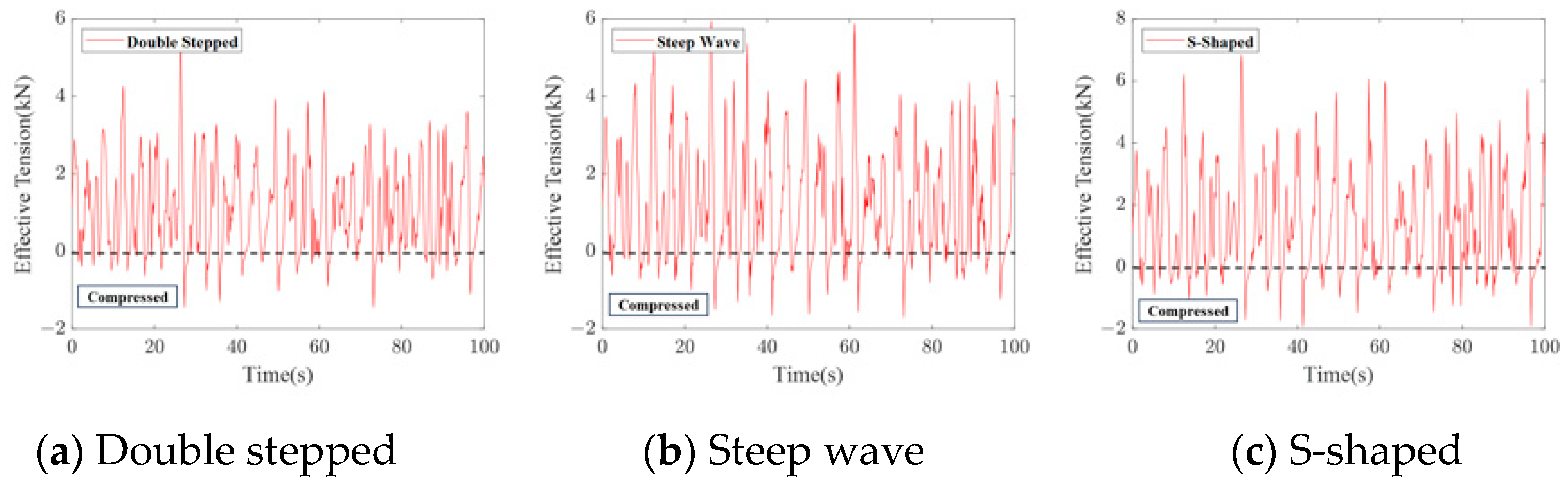 Figure 17, the effective tension at the top of the buoyancy section fluctuates around a positive mean value for all three umbilical configurations, indicating that the cables remain predominantly in a tensioned state. Nevertheless, transient compressive phases are also observed, as evidenced by the negative values of effective tension. These results suggest that although the umbilical cables are generally tension-dominant under dynamic excitation, local compression can still occur intermittently at the top of the buoyancy section due to the combined effects of vessel motion and wave-induced tension variations.