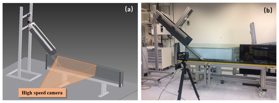A laboratory experimental system was constructed to investigate landslide-generated waves. Similarity principles were applied to ensure dynamic correspondence between model and prototype. Geometric similarity was set at 1:100. Kinematic similarity was enforced by selecting slide mass and release height to reproduce prototype-consistent entry velocities. Dynamic similarity preserved the Froude number for inertia–gravity effects, and introduced the Bingham number to capture yield-stress and viscous resistance characteristic of slides. See Section 3.1 for the details of and . Under these constraints, the laboratory model reproduced the essential physics of landslide-generated waves. The slope was made of PVC (length 1.5 m, width 0.20 m) with adjustable inclination 30°–50°; black sandpaper was bonded to prescribe surface friction. A pneumatically actuated vertical gate at the slope crest restrained the slide until release; the gate opened at 2.5 m/s, after which the slide accelerated downslope and entered water. At the toe, a transparent glass flume (length 2.5 m, depth 0.4 m, width 0.12 m) received the sliding mass; a backlight behind the flume enhanced image contrast. The facilities are summarized in Figure 2. A high-speed camera operating at 400 fps recorded slide motion, water entry, and wave generation. Images were processed in MATLAB 2019 via binary segmentation to extract the pre-entry slide thickness and free-surface profiles. Test conditions were controlled by varying the initial slide mass (from 1000 g to 4000 g) and the gate-to-water distance (from 0.45 m to 0.85 m), while the still-water depth was fixed at 0.2 m and the slope angle was at . More details concern the experimental facilities refer to our previous studies [19,37,52].