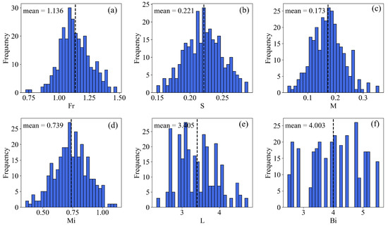 Figure 6 presents the distributions of six predictor variables via 30 equal-width bins. The dashed lines mark sample means. The means of , S, M, , L, and are 1.136, 0.221, 0.173, 0.739, 3.405, and 4.003, respectively. Overall, the predictors are mostly unimodal and approximately symmetric; L shows the tightest spread and highest concentration, whereas is the most dispersed with a slight right skew. The remaining variables are fairly balanced around their means, and no pronounced extreme outliers are evident. Although the predictors differ in physical meaning, their coverage and variability are representative for model fitting.