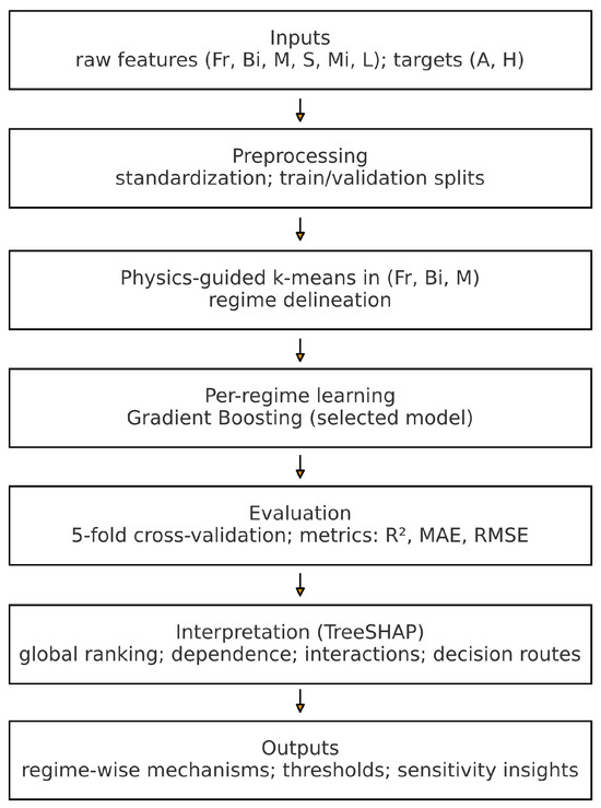 The workflow follows four steps. First, we standardize the inputs and delineate regimes using k-means in so that points with similar driving mechanisms are grouped. Second, within each regime we train six predictors to map controls to wave metrics (A and H), and selected the best performing one. Third, we explain the fitted models using SHAP, which attributes each prediction to the contributing parameters in a locally additive and globally aggregable way. Fourth, we synthesize global rankings, marginal effects, and interactions to form regime-wise mechanism statements that are consistent with residual diagnostics. Figure 7 illustrates the overall data-to-model flowchart of the modeling procedure.