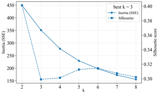 As , , and M encode entry dynamics, rheological constraint, and slide size respectively, clustering on these nondimensional groups provides a physics-consistent partition of the dataset. Details for the selection of clustering criteria see Section 4.1. Figure 10 presents the selection of cluster number k in space. The inertia (SSE) curve shows a pronounced elbow at , and the silhouette score attains a comparatively acceptable value at . Taken together, these two diagnostics balance intra-cluster compactness (SSE) and inter-cluster separation (sihouette), so we adopt for subsequent modeling. We emphasize that these diagnostics are heuristic rather than definitive. The choice k = 3 should therefore be regarded as a pragmatic setting that yields reasonably compact and physically interpretable regimes, while a systematic sensitivity and robustness analysis with respect to k and alternative clustering schemes is left for future work.