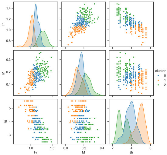 Figure 11 presents the pairwise distributions of the k-means partitions in and highlights how the data populate the bivariate planes rather than merely indicating separability. Along , the cloud stretches diagonally with modest dispersion, suggesting a coordinated increase in entry speed and effective mass; the diagonal elongation implies anisotropic covariance that is well captured by axis aligned decision boundaries of k-means after standardization. In contrast, and display pronounced skew with heavier upper tails in at low or low M, and compressed spreads where or M are large, which is an imprint of yield-limited motion giving way to inertia-dominated entry. Kernel ridges on the diagonals reveal that each cluster admits a distinct internal density profile rather than a simple spherical blob. From a modeling standpoint, this stratification implies reduced heterogeneity within clusters for the predictors.