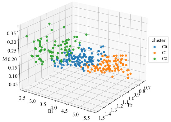 Before training the prediction model, we separate the dataset into several groups using k-means based on three physical criteria extracted from the two scenarios: the Froude number (entry velocity scale), the Bingham number (material rheology), and the effective mass ratio M (slide intensity), which jointly capture the dominant kinematic, constitutive, and geometric controls on wave generation [53]. Figure 8 illustrates the schematic of data clustering [54,55]. Given that our emphasis is on SHAP-based interpretation and considering wave characteristics via cluster-defined regimes, we deliberately adopt the mature, widely used, and simple-yet-effective k-means algorithm to keep the clustering step parsimonious.