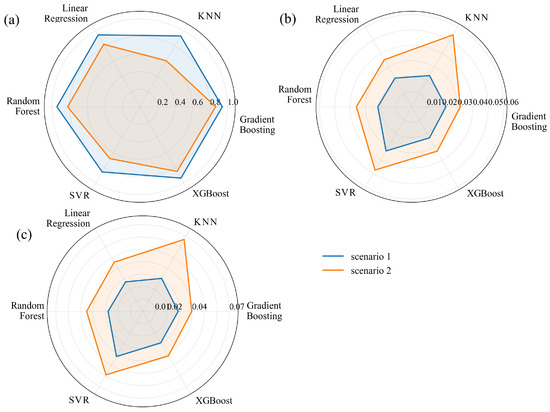 Radar plots of evaluation metrics (a) , (b) MAE, (c) RMSE for the six prediction models.