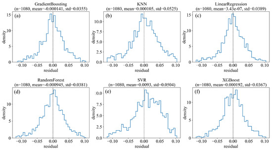 Residual distribution of the six selected prediction models: (a) gradient boosting, (b) KNN, (c) linear regression, (d) random forest, (e) SVR, (f) XGBoost.