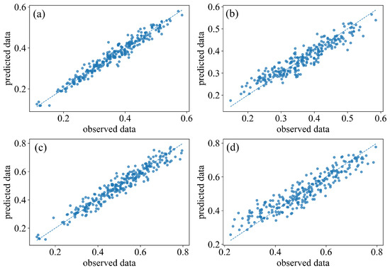 Comparison of the observed data with predicted data of gradient boosting: (a) A (scenario I); (b) A (scenario II); (c) H (scenario I); (d) H (scenario II).