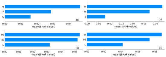 Mean absolute SHAP importance of each predictor variable: (a) A (scenario I), (b) H (scenario I), (c) A (scenario II), (d) H (scenario II).