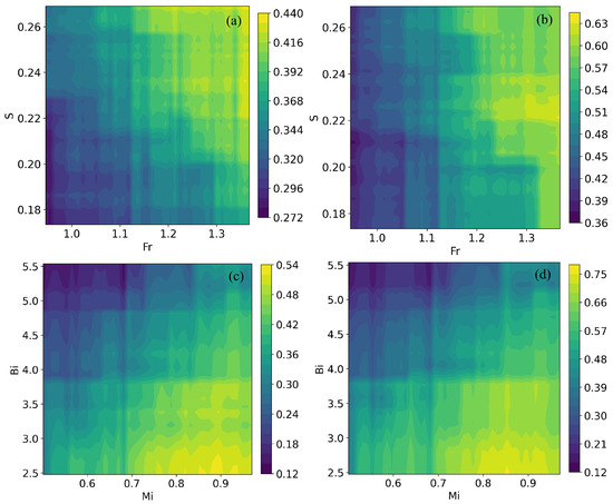 Figure 20 presents 2D dependence maps for the same top interaction pairs as Figure 19, showing model output over the and planes. Brighter regions indicate larger predicted responses. In Scenario I, the maps increase toward the high , high S corner, confirming that greater inertia combined with thicker slides yields larger waves, with mild nonlinearity along . In Scenario II, the surfaces rise most strongly toward high , high , evidencing pronounced synergy between available mass and rheological coherence. The sharper gradients and broader bright plateaus in Scenario II are consistent with a regime where rheology–mass coupling, rather than geometry alone, governs how efficiently input momentum is converted into the scaled wave amplitude and height.